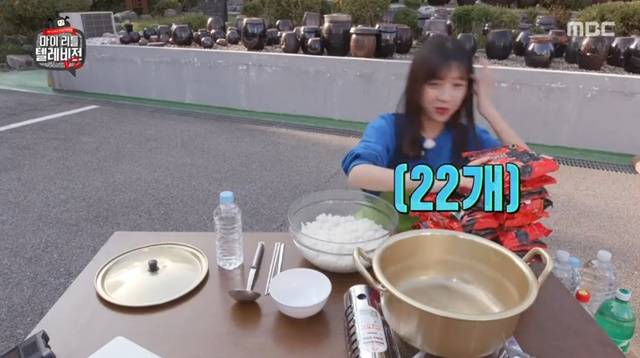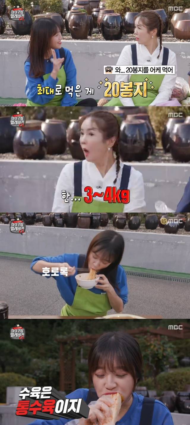 이어 쯔양은 먹방을 시작했다. 쯔양은 준비된 흰쌀밥과 라면 22봉지를 확인했고 라면 5봉지를 끓여 먹었다. 쯔양은 통수육 먹방도 선보였다. 쯔양은 수육에 김치를 감싸 한입에 먹으며 놀라움을 선사했다.(사진=MBC '마이 리틀 텔레비전 V2' 캡처)