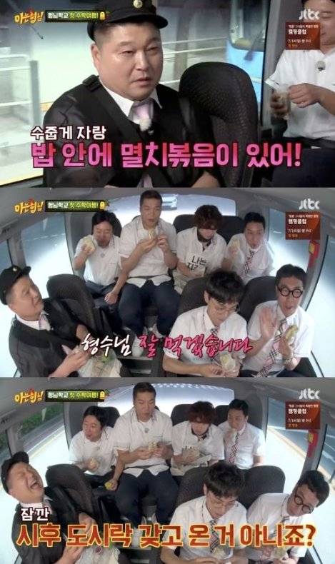 우여곡절 끝에 김희철이 도착했고, 멤버 모두 버스에 탑승했다. 수학여행 장소로 이동하는 차 안에서 강호동은 아내가 만들어준 도시락을 꺼냈다. 강호동은 "소풍간다고 집에서 진짜로 도시락을 밤새 싸줬다"며 아내가 직접 싼 도시락을 자랑했다.