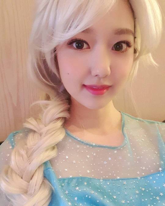 공개된 사진 속 이혜성은 금발 가발을 쓰고, 하늘빛 드레스를 입고 겨울왕국의 엘사로 변신한 모습이다.