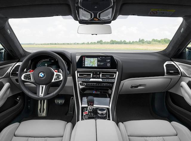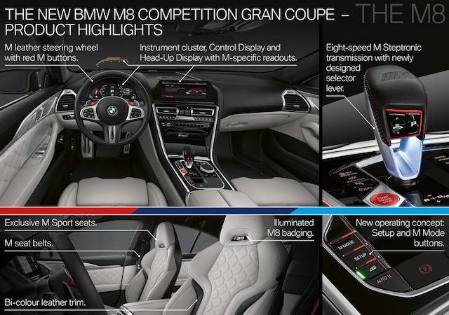인테리어는 풍부한 공간감과 고급스러움을 동시에 느낄 수 있으며, M 모델만의 독특한 레이싱 풍미를 버무렸다. M 전용 가죽 스티어링 휠에는 퍼포먼스를 극대화할 수 있는 M 버튼이 자리하며, 새롭게 디자인한 변속 레버도 눈에 띈다. 시트는 타공된 3D 퀼팅 M 스포츠 시트로 M8 그란쿠페에는 메리노(Merino) 가죽이, 컴페티션 버전에는 알칸타라 포인트를 선택할 수 있는 바이-컬러 풀레더 시트가 달린다.