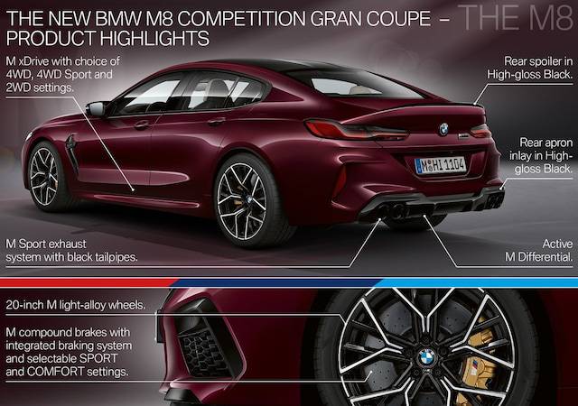 M8 그란쿠페는 길이 5,098mm, 너비 1,943mm, 높이 1,420mm, 휠베이스 3,027mm로 2도어 모델보다 231mm 길며, 휠베이스는 200mm 확장됐다. 여기에 V8 4.4L 트윈 터보 엔진과 8단 M 스텝트로닉 변속기, M xDrive 시스템은 여타의 M8 모델과 같지만 퍼포먼스는 끌어올렸다. 그 결과 최고 625마력(6,000rpm)의 출력과 76.5kg·m(1,800~5,800rpm)의 최대토크를 발휘한다. 정지상태에서 시속 100km까지 가속하는 데는 3.2초가 걸리며 안전 최고속도는 250km/h로 제한된다.