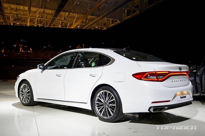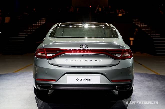 후면부는 더욱 얇고 길어진 리어램프를 통해 와이드하면서 낮고 안정적인 인상을 구현했다. 좌우가 이어진 리어램프는 그랜저의 상징으로 역대 국산차 중 가장 얇은 스타일로 완성됐다. 리어펜더의 유려한 볼륨감이 인상적이며 엠블럼은 트렁크 오프너 역할을 겸한다.