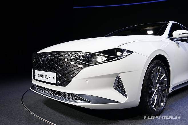 더 뉴 그랜저의 전면부는 파격적인 디자인 변화를 담았다. 파라메트릭 쥬얼 패턴 라디에이터 그릴과 LED 헤드램프, 주간주행등이 일체형으로 구성된 전면부는 전기차로 넘어가는 과도기적 디자인을 담았다. 그릴을 내세운 내연기관 디자인 그랜저IG는 완전히 다르다.