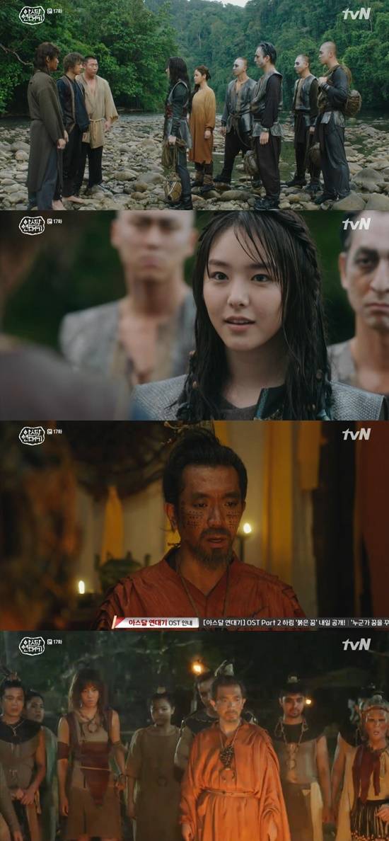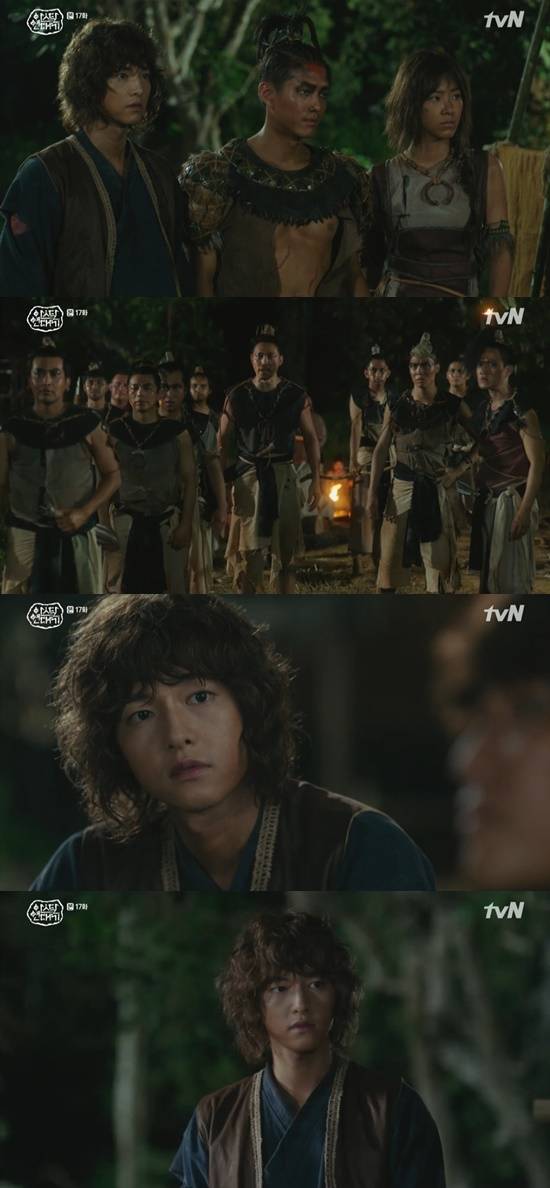 21일 방송된 tvN 토일드라마 '아스달 연대기' 17화에서는 은섬(송중기 분)이 모모족의 샤바라 카리카(카라타 에리카)의 도움으로 폭포의 심판에서 살아 나왔다.