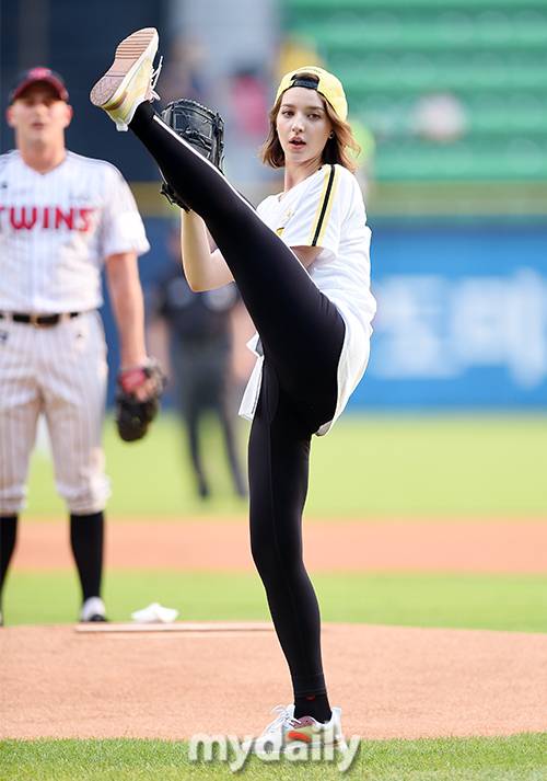 [마이데일리 = 김성진 기자] 방송인 안젤리나 다닐로바가 3일 오후 서울 잠실야구장에서 진행된 '2019 신한은행 MY CAR KBO리그' 삼성 라이온즈와 LG 트윈스의 경기에 앞서 시구를 하고 있다.- ⓒ마이데일리(www.mydaily.co.kr). 무단전재&재배포 금지 -