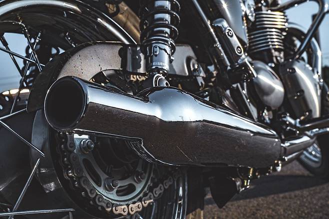 클래식한 형태의 티어드롭(눈물방울) 연료탱크, 그리고 끝 부분이 좁아지는 형태의 피슈터 머플러도 멋과 감성을 더한다.