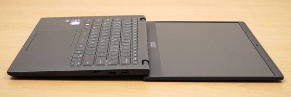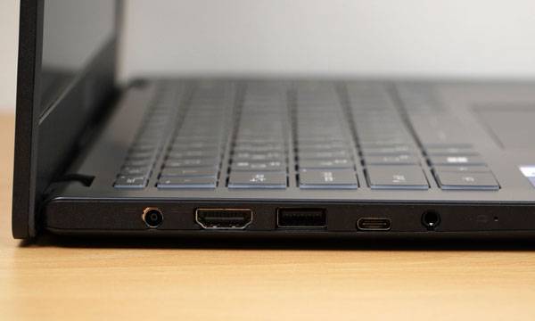 화면이 180도까지 접히는 레이 플랫 디자인 특성 때문에 후면부에는 입출력 포트를 배치할 수 없으므로 좌우 측면에 모든 I/O 기능이 들어간다. 좌측에는 AC 전원 어댑터 단자를 비롯해 HDMI 출력 포트, USB 3,2 Gen2 Type-A 포트, DisplayPort 기능 및 USB-PD 고속 충전을 지원하는 USB 3.2 Gen2 Type-C (USB-C) 포트, 3.5mm 오디오 콤보 잭이 배치되어 있다.