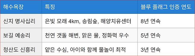 완도의 신지 명사십리해수욕장은 이 인증을 아시아 최초로 8년 연속 받았으며, 전 세계 블루 플래그 해변 중 ‘TOP 10’ 스페셜 멘션에도 선정되는 쾌거를 이뤘습니다.