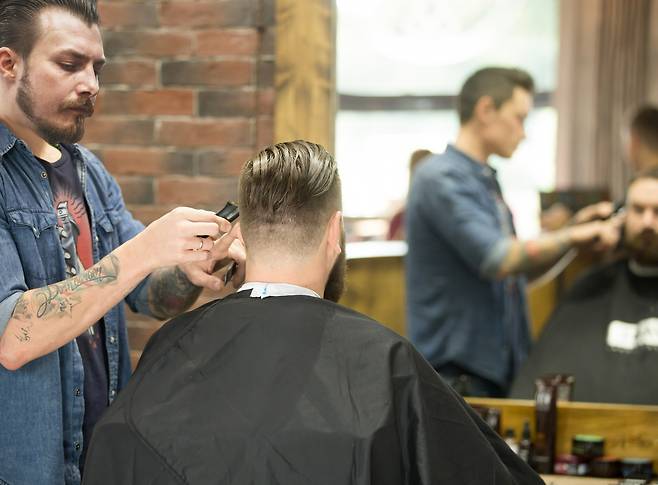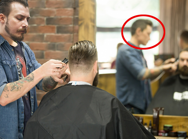 거울 속에 비친 미용사가 다른 사람입니다.
