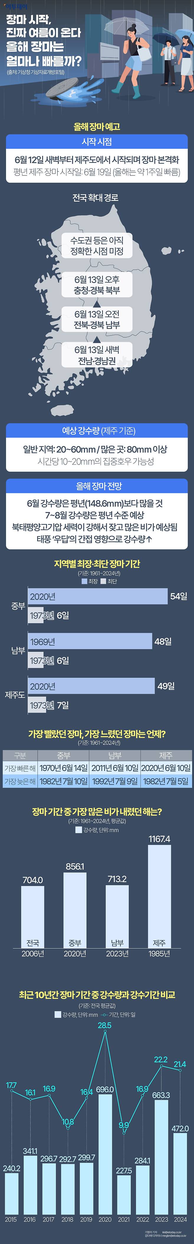 본격적인 장마는 19일부터로 예상되는 현재, 올해는 얼마나 많은 비가 쏟아질까요? 기상청은 6월 강수량이 평년보다 많은 것으로 봤는데요. 2020년 중부지방은 무려 54일이라는 긴 장마 기간을 보냈고, 2006년에는 전국 평균 강수량 704.0㎜가 장마 기간에만 쏟아졌습니다.