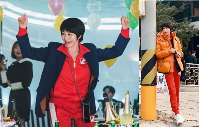 우선 드라마 ‘하이에나’에서 수단과 방법을 가리지 않는 변호사 ‘정금자’의 캐릭터를 완성하기 위해 자주 트레이닝 복을 입고 등장했다. 때로 크로스백이나 자켓을 매칭하는 극악의 조합도 모두 소화해 버리는 정금자였다.