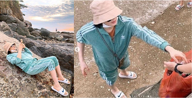 작품에서뿐만 아니라 평소에도 트레이닝복을 즐겨 입는 김혜수. 친구들과 바닷가에 쓰레기를 치우러갔던 뜻깊은 여행에서 트레이닝복 만한게 없었다.