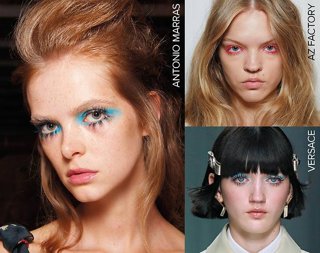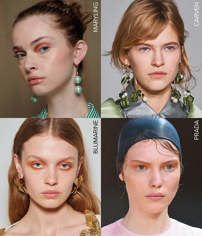 봄소식은 눈가에서 가장 먼저 싱그럽게 피어난다. 프라다와 아쉬시, 블루마린 등 다수의 컬렉션에서 부드럽고 온화한 봄의 컬러가 포착되었다. 아쉬시는 형광기 감도는 핑크 섀도를 눈두덩 가득 터치했고, 블루마린과 프라다는 오렌지를 택했다. 봄기운 가득한 캔디 컬러로 눈가를 장식하기 부담스러우면 메릴링의 모델처럼 컬러의 면적을 줄이거나 아이라인, 혹은 언더라인에만 포인트를 줘도 된다.