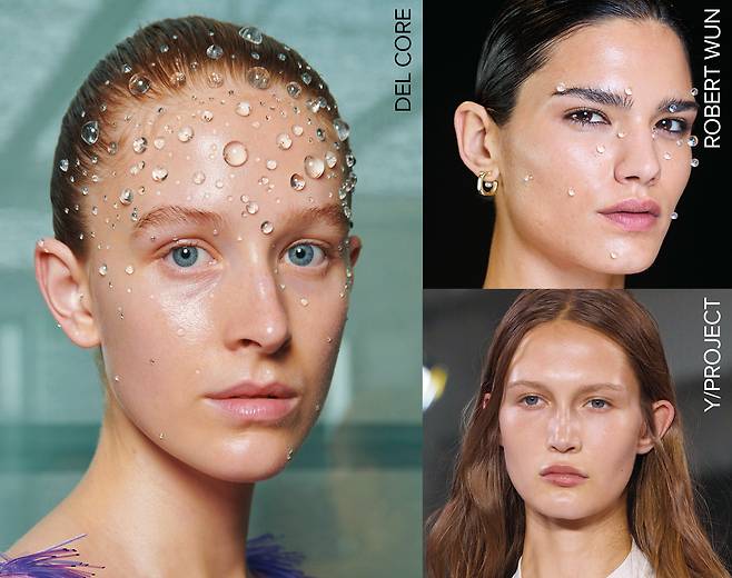 런웨이에서 확인한 극단적인 글로 스킨은 컬렉션의 모델처럼 세럼을 듬뿍 머금은 쿠션으로 피부 톤을 균일하게 보정하고, 다른 색조 메이크업은 최대한 절제하는 것이 중요하다. 투명한 펄 또는 젤이나 물이 뚝뚝 떨어질 듯한 하이퍼 글로 스킨이 부담스럽다면, 얼굴뿐 아니라 목과 데콜테 라인까지 진줏빛 터치를 더해볼 것.