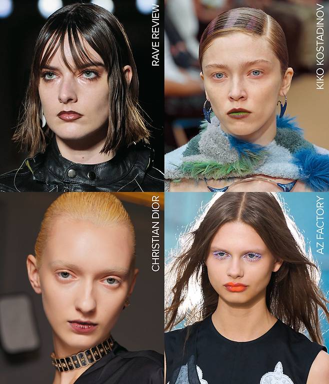 볼륨감 있고 입체적인 입술로 거듭나기 위해 런웨이에서 선택받은 또 다른 룩은 바로 ‘옹브레’, 즉 투톤 립이다. 1990년대 배우 심은하, 김혜수의 브라운 입술을 떠오르게 하는 모스키노의 브라운 립 라인 메이크업을 시작으로, 뉴트로 감성에 웬즈데이 감성을 더한 레이브 리뷰. 그리고 내 맘대로 얼룩덜룩하게 터치한 에이지팩토리와 크리스챤 디올까지. 올봄 입술은 고정관념에서 벗어나 다채로운 상상력으로 물들일 예정이니 기대해도 좋다.