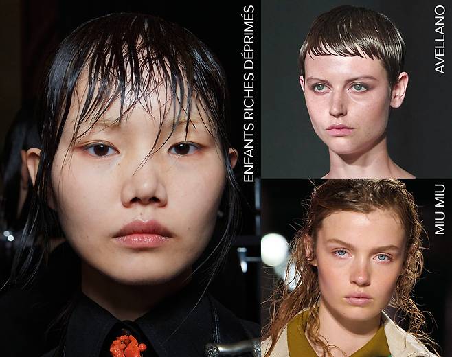 사나흘 머리를 감지 않은 듯한 헤어가 등장했다. 미우미우의 모델은 바닷바람에 휘날린 듯 떡진 헤어 그 자체! 예측 불가능한 그런지 헤어는 헤어 오일을 사용하면 지저분하지 않게 연출할 수 있다. 모발 중간부터 머리에 전체적으로 바르거나 스크루 브러시에 오일을 듬뿍 묻혀 앞머리를 브러싱할 것. 이때 뿌리부터 오일을 누르듯 바르면 컬렉션처럼 기름진 듯한 느낌을 완성할 수 있다.