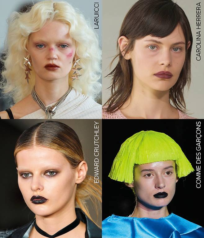 다크 립이 귀환했다. 특히 2024 S/S 시즌엔 다크 립의 스펙트럼이 더욱 넓어진 것이 특징. 꼼데가르송과 버버리 컬렉션에서는 시리도록 어두운 블루 블랙 립스틱을 선택했고, 에드워드 크러칠리와 캐롤리나 헤레라의 모델은 딥 브라운 립스틱을 장착한 채 런웨이를 활보했다. 라루이치는 딥 브라운 립스틱을 입술 가득 바른 채 콧잔등과 볼 부근에 스크래치가 난 듯 붉게 터치해 일명 ‘센 언니’ 메이크업의 종지부를 찍었다.