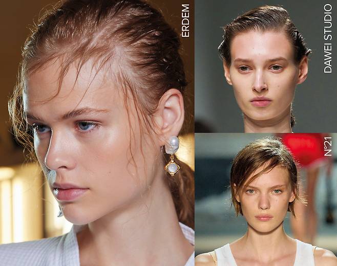 이번 시즌엔 헤어 텍스처에 주목해야 한다. 에르뎀의 모델은 헤어를 앞머리와 옆머리를 가닥가닥 내어 촉촉하게 표현했고, 오토링거와 다웨이 스튜디오 캣워크에서는 촉촉하고 볼륨감 있는 헤어를 선보였다. 헤어는 샴푸 후 타월 드라이한 모발에 리브 인 트리트먼트 제품을 고르게 펴 바르고, 원하는 헤어스타일로 연출하면 된다.
