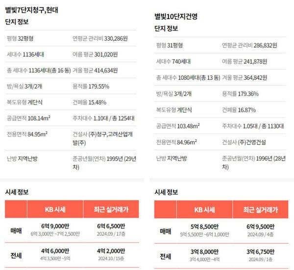 전용면적 84㎡ 기준으로 별빛마을건영10단지 매매가격은 6억9500만원, 전세금은 3억6750만원이다. 별빛마을청구현대7단지는 같은 면적 기준으로 매매가격이 6억6500만원, 전세금은 4억2000만원 수준이다.