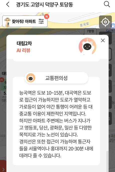 이 단지들은 신축 단지라 AI리뷰가 없어 바로 옆 단지인 대림2차 아파트 AI리뷰를 참고했다. 교통 편의성 평가를 보면 “능곡역이 도보 10~15분 대곡역은 도보로 접근 가능하지만 도로가 열악하고 가로등이 없어 야간 통행이 어려운 등 대중교통 이용이 제한적”이라는 내용이 담겨 있다.