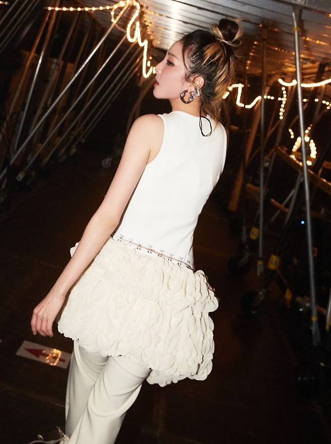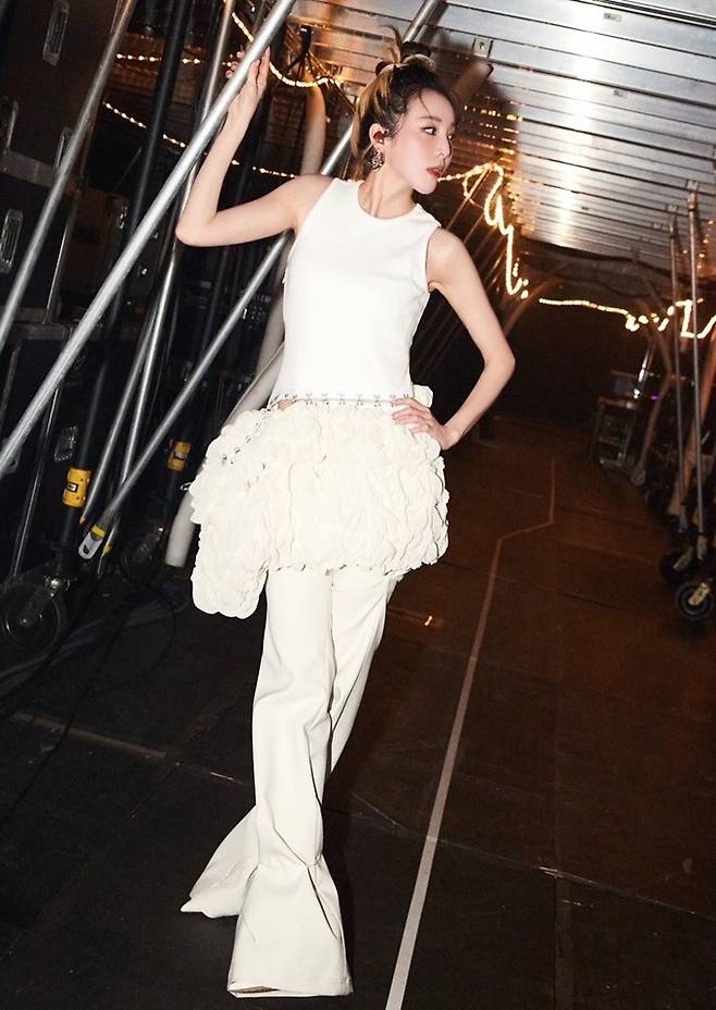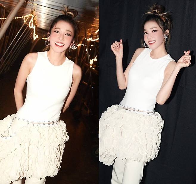 공개된 사진 속 산다라박은 몸무게 39kg의 군살 1도 없는 보디라인이 돋보이는 핏앤플레어 무대 의상을 입고 포즈를 취한 모습이 담겼다.