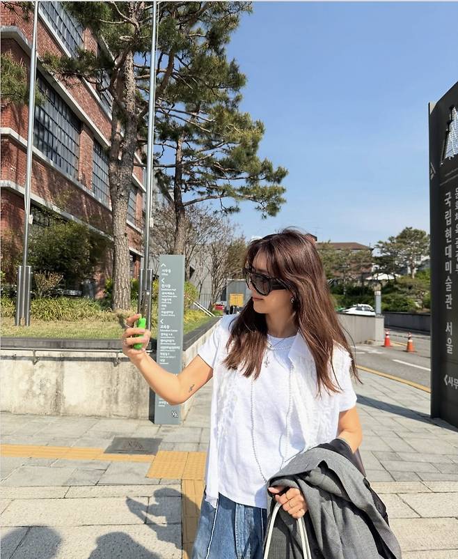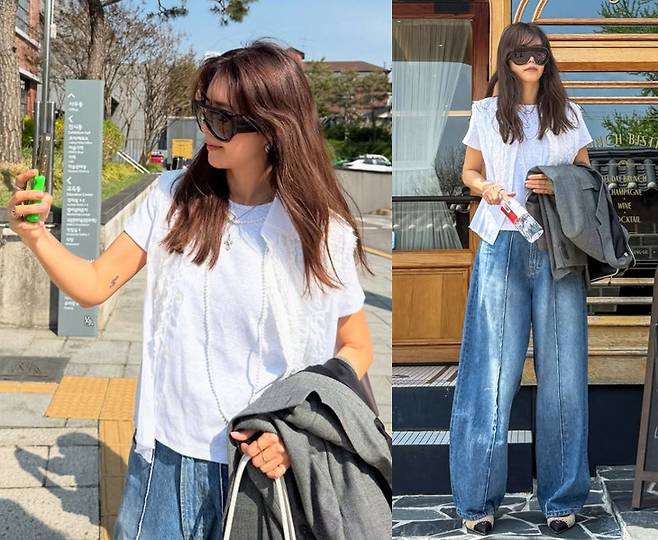 채정안이 와이드 데님 팬츠에 흰 티셔츠, 그리고 간단한 블레이저 하나만으로 내추럴한데 멋있는 나들이룩으로 시선을 사로잡았습니다.