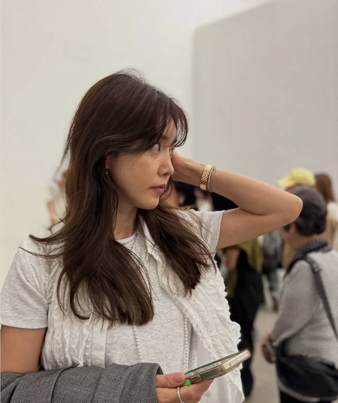 은은한 진주 디테일과 셔링 텍스처가 들어간 화이트 탑은 기본 아이템 같지만 채정안의 절제된 스타일링으로 한층 더 고급스럽게 재해석됐습니다.