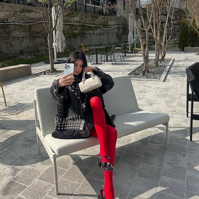 두 번째 사진에서 한소희는 블랙 스터드 장식 재킷과 미니스커트, 그리고 강렬한 레드 타이즈로 시선을 사로잡는다. 볼드한 플랫폼 힐과 미니 화이트 핸드백, 그리고 셀카를 찍는 자유로운 포즈가 Y2K 감성의 스트리트 패션을 연출한다. 전체적으로 과감한 컬러 매치와 액세서리 활용이 한소희 특유의 힙한 분위기를 극대화한다.