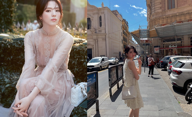 세 번째 사진에서는 아이보리 컬러의 크로셰 원피스를 선택해 로맨틱하고 내추럴한 무드를 연출했다. 화이트 숄더백과 블랙 앵클부츠를 매치해 빈티지하면서도 세련된 여행지 스타일을 완성했다. 밝은 햇살 아래, 자연스러운 포즈와 함께 한소희만의 청순하면서도 시크한 매력이 잘 드러난다.