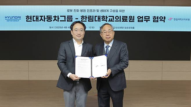 [M포스트 구기성 기자] 현대자동차·기아가 한림대학교성심병원(경기도 안양시 소재)에서 한림대학교의료원과 '로봇 친화 병원 구성 사업 공동 추진을 위한 업무협약(MOU)'을 체결했다고 7일 밝혔다.