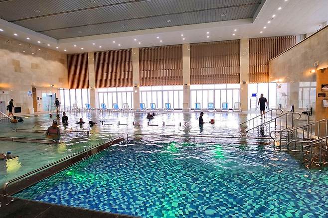 1층에는 큰 규모의 해수풀 <딸라소풀> 포함 5개의 테라피실이 있어 몸과 마음을 치유할 수 있습니다. 센터 앞에 위치한 명사십리에서 해수를 정화해 끌어올린 뒤 사용해 부모님 효도 여행으로 각광받는 명소입니다.
