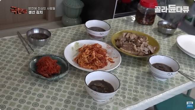 오전 작업을 마치고 점심시간이 되면 명태김치와 수육이 한상에 올라온다. 수육은 마늘, 대파, 양파, 월계수잎, 된장, 쌀뜨물로 한 시간가량 삶아 준비한다. 삶은 고기에 김치를 올려 한입 먹으면 감칠맛이 입안 가득 퍼진다.