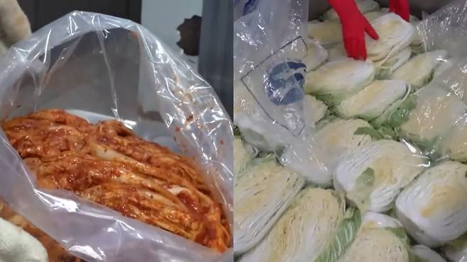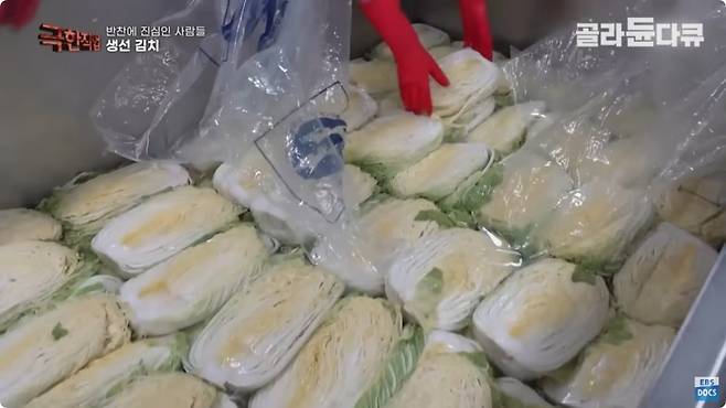 이튿날 아침, 물이 빠지고 말랑해진 배추를 건져낸다. 이후 총 세 차례 세척 과정을 거친다. 이물질 제거를 위해 손으로 배추를 수십 번 들었다 놨다 해야 해서, 공장 직원들은 이 작업이 가장 힘들다고 말한다.