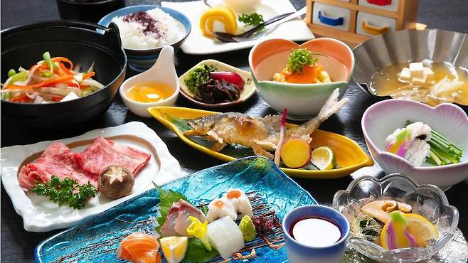 석식은 가이세키로 제공되며, 이용 시간은 오후 6시, 6시 반, 7시 중 선택 가능하다. 조식은 뷔페식이며, 오전 7시부터 9시까지 이용 가능하니 참고하자.