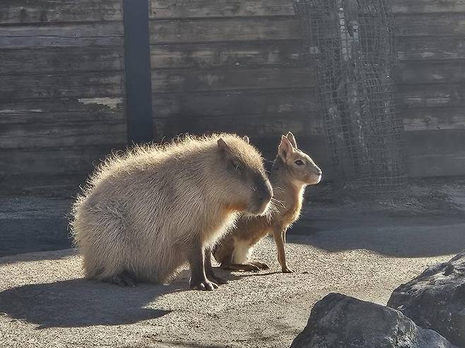 항상 평화로운 표정으로 지그시 사물을 바라보는 카피바라는 느긋하고 순한 성격+푸짐한 체구+사람을 전혀 무서워하지 않는 태도 덕분에 SNS에서 핫한 귀여운 동물인데요.