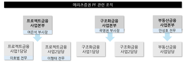 메리츠증권에서 PF 사업이 주력인 조직은 프로젝트금융사업본부다. 프로젝트금융사업1담당, 프로젝트금융사업2담당 조직을 두고 딜 발굴과 관리를 맡고 있다. 부동산금융사업본부와 구조화금융사업본부도 해외 부동산 유동화증권 발행 등 별도의 사업을 벌이면서 일부 PF 관련 업무를 하는 것으로 알려졌다.
