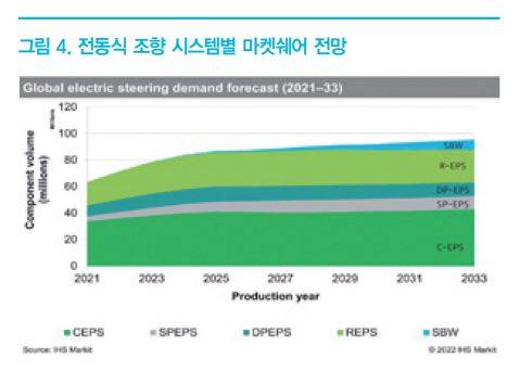 <그림 4>는 전동식 조향 시스템 분류별 글로벌 마켓쉐어를 전망한 것인데, C타입 MDPS가 여전히 많은 양을 차지하고 있는 가운데 2025년 부터는 SBW(Steer by Wire, 기계적 연결없이 전기 신호로 제어) 시스템이 본격적으로 양산되면서 비중이 증가할 것이라는 전망이다.