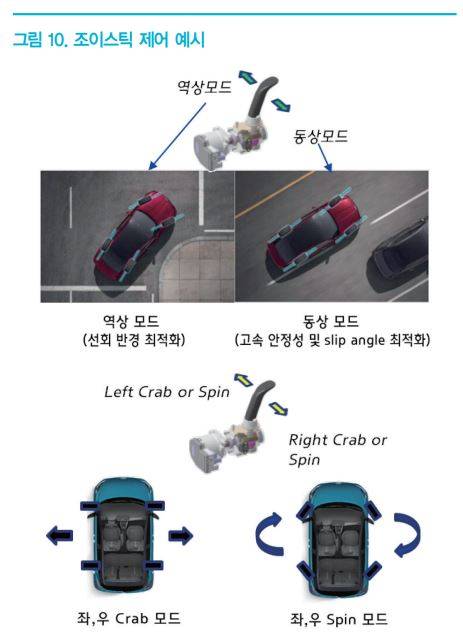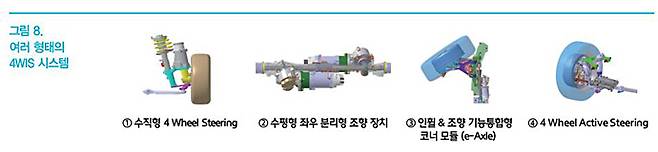 모비스가 개발하고 있는 4WIS는 <그림 8>처럼 수직형, 수평형, 코너모듈 통합형, 4 Wheel Active Steer의 4가지가 있다. 4륜 독집 제어로 인하여 <그림 9>와 같이 대각주행, 크랩 주행, 제자리 회전, 피봇 회전 등 여러가지 주행 모드가 가능하다.