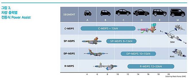 <그림 3>은 차량의 세그먼트별로 위에서 설명한 분류가 어떻게 적용되는지 간략히 나타내었다. 차량 출력에 따라 Pinion 직접 구동 타입은 Single과 Dual타입으로 나눠 적용할 필요가 있으며, 이외 D세그먼트 이상에 해당되는 큰 차량 위주로는 Rack 직접구동 타입의 R-MDPS가 시장에서 적용되고 있다.