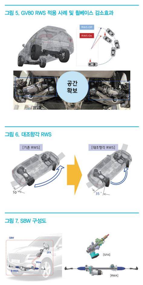 RWS란 Rear Wheel Steering의 약자로서, 차량의 주행 상황에 따라 전륜의 조향각에 맞춰 후륜을 능동적으로 조향하는 시스템이다. 차량의 후륜을 조향 함으로써 저속 주행시 회전 반경을 축소하고, 고속 주행시에는 차량 안전성을 확보하는 대표적인 기술이다. 전기차 시장이 확대되면서 휠베이스가 증가하는 차량이 많아 지므로, 차량 안전성 및 주행 편의성 확보를 위해 RWS 시스템 시장 요구가 증가하고 있다. RWS는 후륜 양쪽을 하나로 연결하는 타입과 각각 독립적으로 나눈 타입으로 구분할 수 있는데, <그림 5>는 GV80차량에 모비스에서 선행 개발 후 장착된 후륜 양쪽을 독립적으로 나눈 독립형 RWS를 보여준다. 이런 독립형 RWS의 적용은 차량 공간 확보에 유리하고, 후륜 양쪽을 독립적으로 제어함으로써 제동력 향상에도 도움이 된다. <그림 5>의 GV80에 적용된 선행 개발 사양은 타이어 회전각을 10도까지 조향할 수 있는 시스템으로 회전반경을 최대 23%까지 축소하는 효과를 가져올 수 있다.