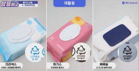 추가로, 크리넥스, 하기스, 베베숲 에코는 재활용 등급이 표기되어 있지는 않았지만, 캡에 스티커가 부착되어 있지 않아, 실제 분리수거 시 조금 더 편리하다고 보였습니다.