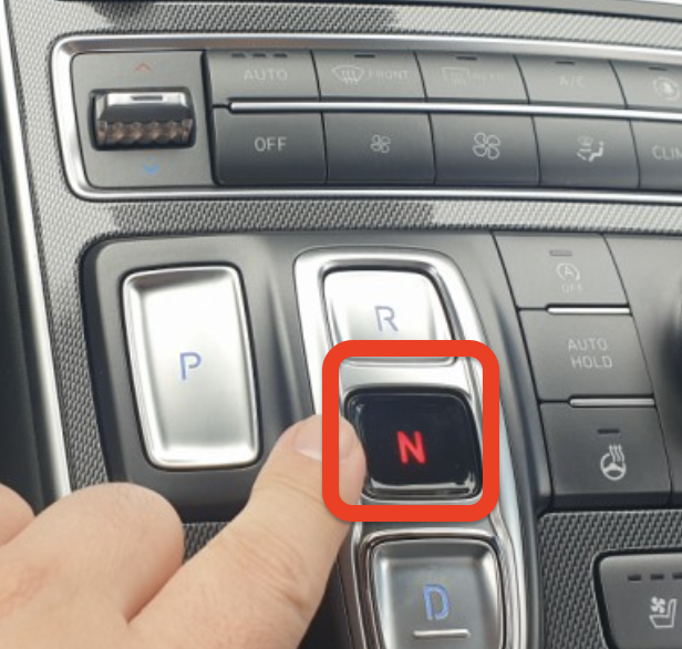 방법: P단으로 주차하고 시동을 끈 직후, 브레이크를 밟은 채로 기어의 'N' 버튼이나 다이얼을 길게(2~3초 이상) 누르고 있으면, 계기판에 "중립(N) 상태로 전환되었습니다" 라는 안내와 함께 설정이 완료됩니다.