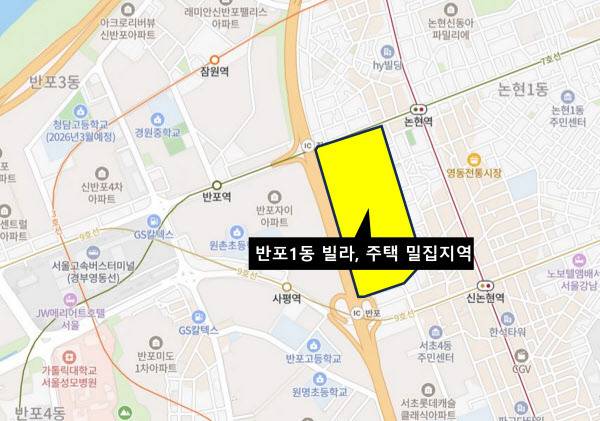 반포1동 701~731번지 일대는 경부고속도로 잠원IC에서 7호선과 신분당선이 지나는 논현역 사이에 있다. 인근 반포동 ‘반포자이’(☞단지정보 알아보기), 잠원동 ‘메이플자이’ 등 재건축 아파트와 달리 주택, 빌라 밀집 지역이다.