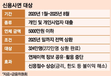 2025년 9월, 정부는 2020년 1월부터 올해 8월까지 발생한 5000만원 이하 연체 채무를 올해 말까지 모두 갚는 개인 및 개인사업자에게 ‘신용사면’을 적용하는 대규모 결단을 발표했다.