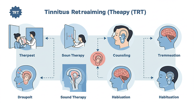 - 소리 치료: 이명을 가능한 덜 듣도록 유도하는 방법으로, 지시적 상담과 함께 진행됩니다.