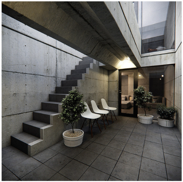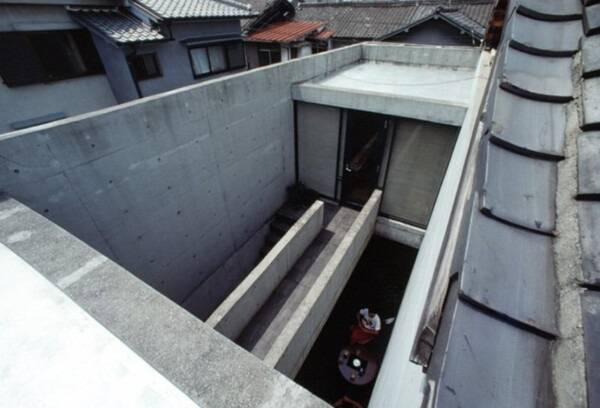스미요시 주택은 연면적 약 65㎡ 남짓한 작은 2층 집이다. 그 구조의 핵심은 집을 세 개의 동등한 부분으로 나누고, 가운데에 지붕 없는 중정과 계단을 배치하는 것이다. 안도는 ‘노출 콘크리트’라는 투박하면서도 심플한 재료를 그대로 드러냈다. 단열재 없이 벽과 천장을 콘크리트로만 완성해, 겨울에는 춥고 여름에는 벽체가 식지 않는 불합리함까지 감수했다. 대신, 외부 세계와 완전히 단절되는 외벽과 중정의 개방감이 강렬한 공간 대비를 이룬다.