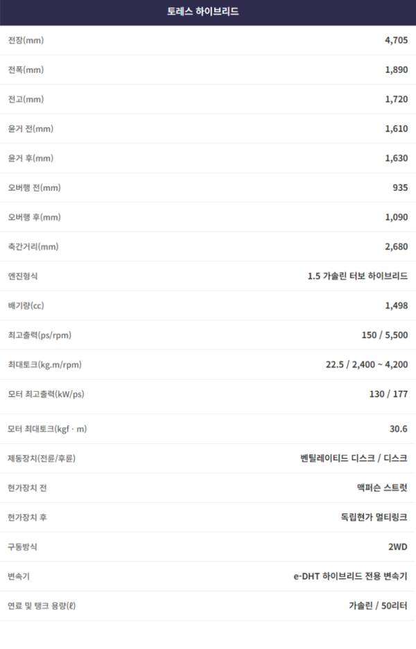 토레스 하이브리드는 1.5리터 터보 가솔린 엔진과 직병렬 듀얼 모터가 결합된 ‘듀얼 테크 하이브리드 시스템’을 탑재했다.