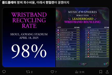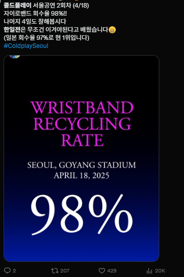 팔찌 회수율 98% 보니까 콜드플레이 한일전 승리각.