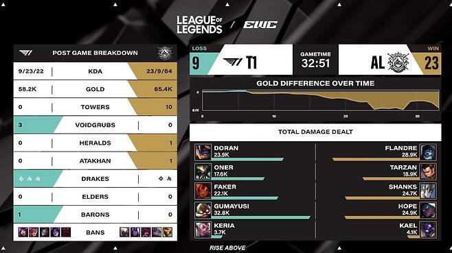 그리고 잘 성장한 '플랑드레'의 요릭이 '도란'의 럼블을 1:1로 잡고 바텀 1차 타워까지 파괴했다. AL의 전투력은 대단했다. 어그로 핑퐁 계산은 완벽했고, T1은 미드 한타에서 무너지며 AL이 일찌감치 승기를 잡아갔다.
