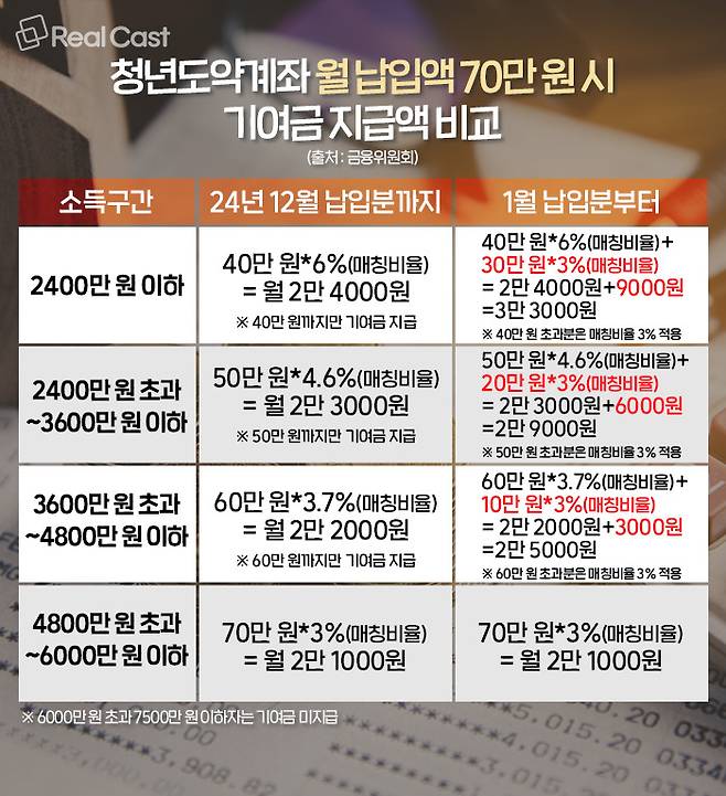 이번에 확대되는 기여금 지원 기준은 25년 1월 납입분부터 적용되며 신규가입자만 혜택을 보는것이 아닌 기존에 청년도약계좌에 가입한 청년들도 1월 납입분부터 같은 혜택을 적용받게 됩니다.